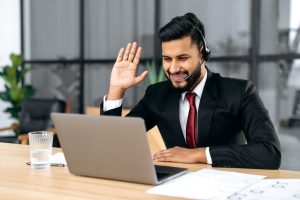 Successful confident indian or arabian businessman, company ceo, with headset, look at laptop screen, waves hand, talking with business client or partner online, explain business strategy and plan
